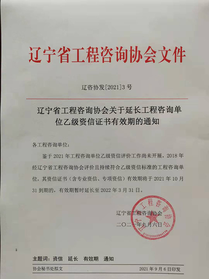 遼寧省工程咨詢協會關于延長工程咨詢單位乙級資信證書有效期的通知