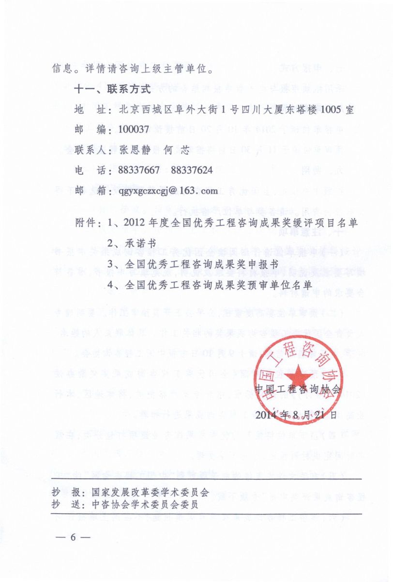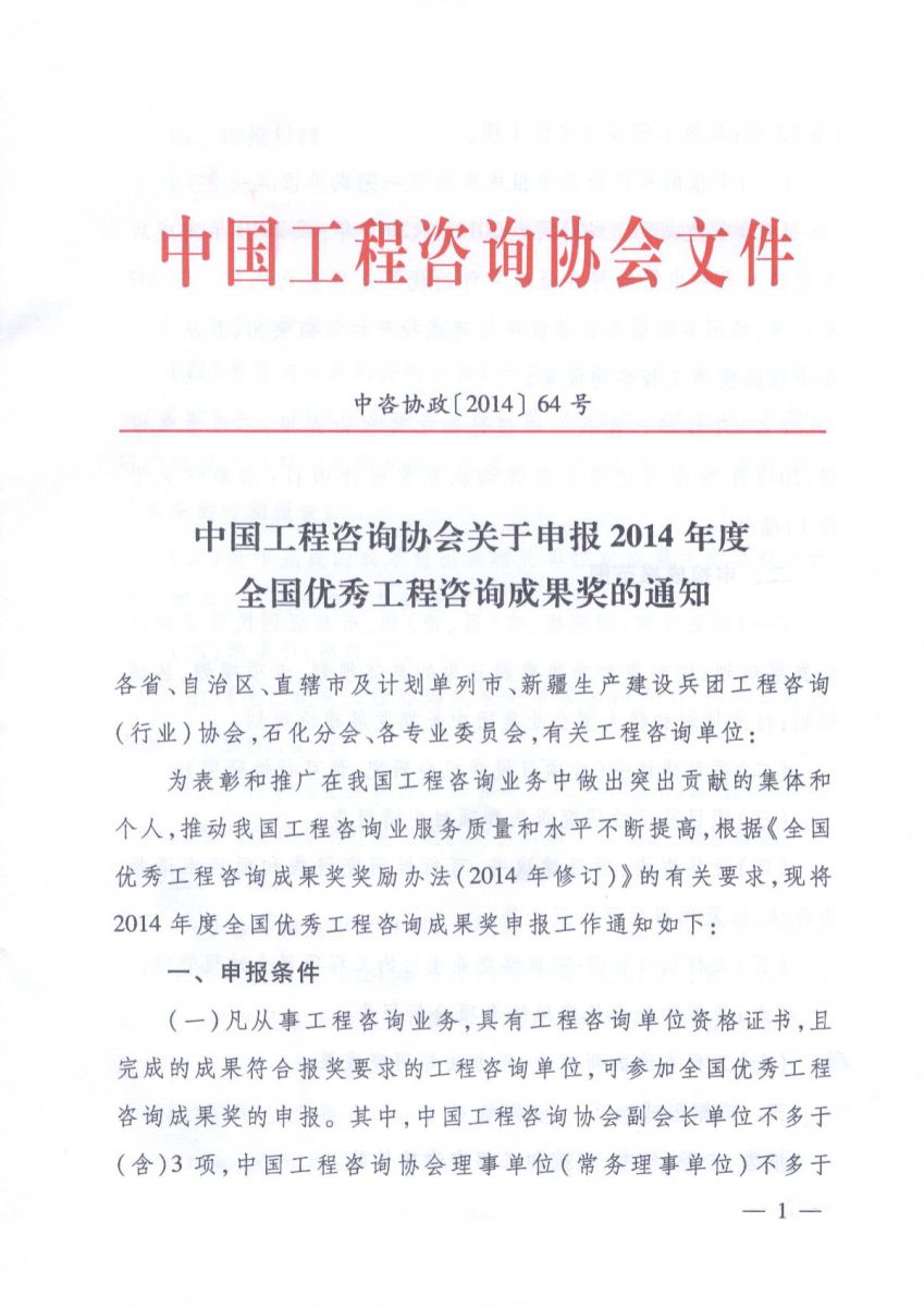中國工程咨詢協(xié)會(huì)關(guān)于申報(bào)2014年度全國優(yōu)秀工程咨詢成果獎(jiǎng)的通知