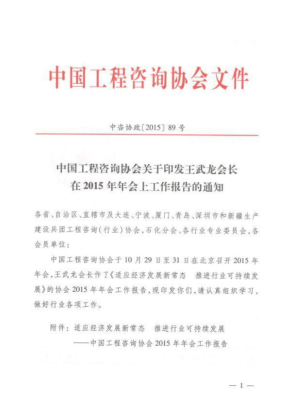 中國(guó)工程咨詢協(xié)會(huì)關(guān)于印發(fā)王武龍會(huì)長(zhǎng)在2015年年會(huì)上工作報(bào)告的通知