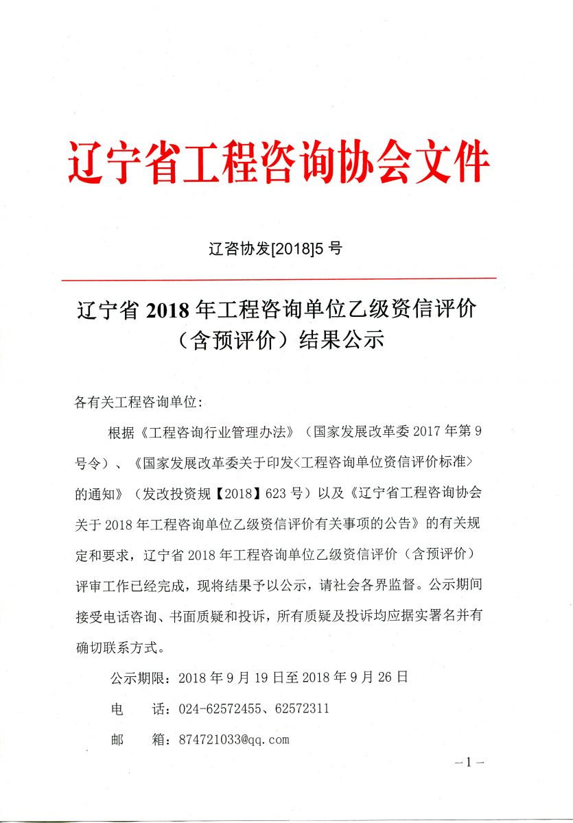 遼寧省2018年工程咨詢單位乙級資信評價(含預評價)結果公示